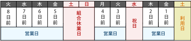 ・「8日前の午前中」には、土日祝及び組合休業日は日数に含みませんので、ご了承ください。