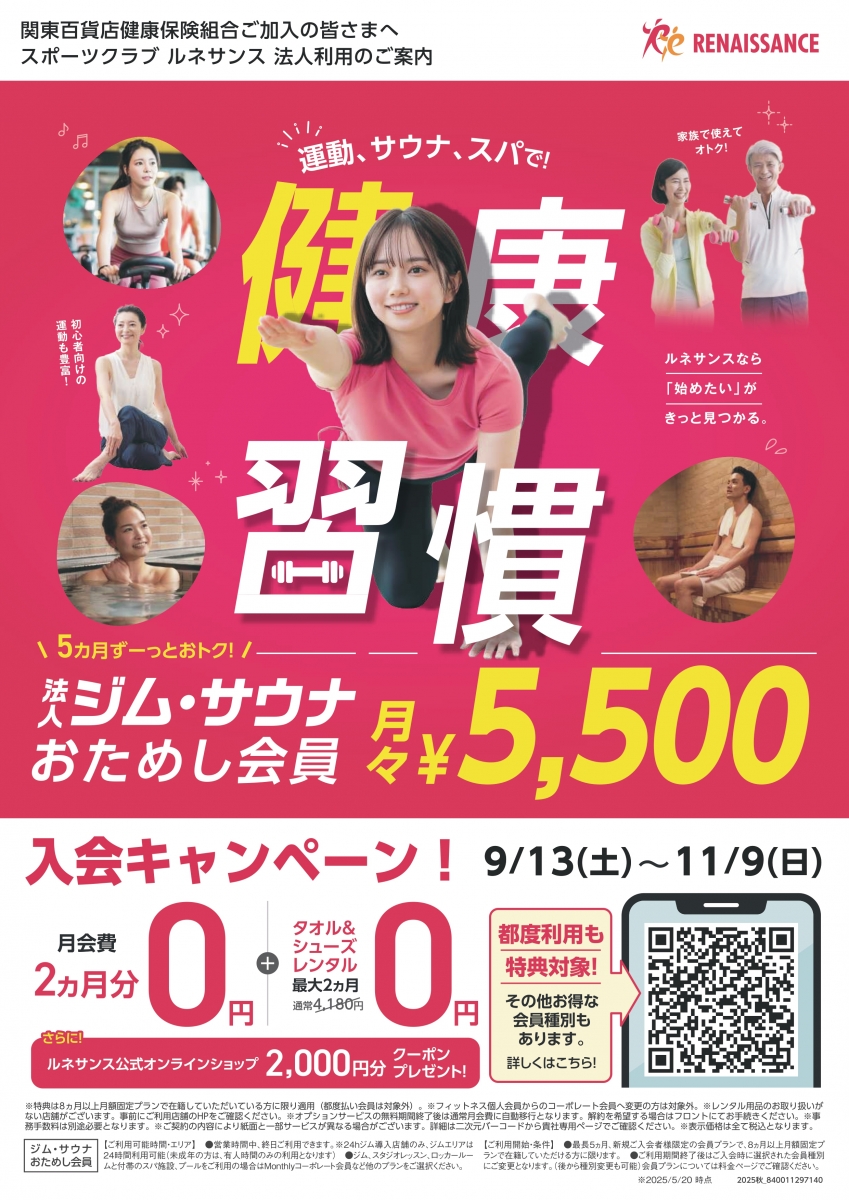 ルネサンス法人会員LINE公式アカウント(平日10:00~17:00)https://lin.ee/JUBXfLd