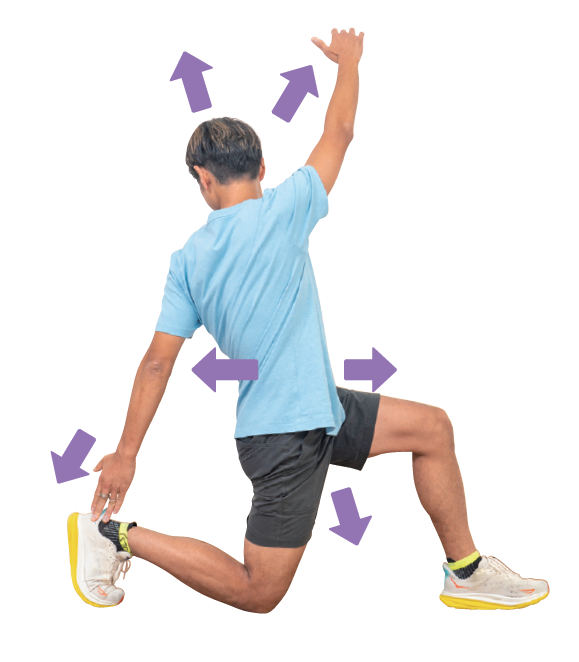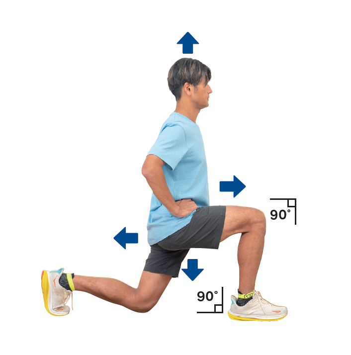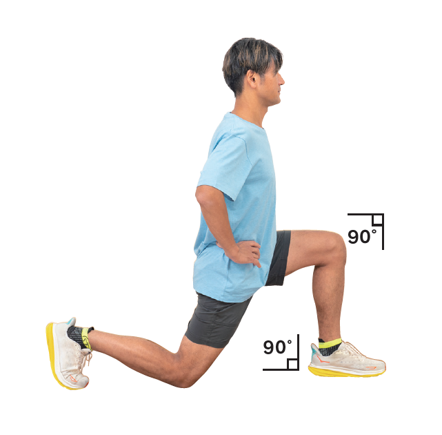 右足を後ろに大きくステップバックし、左足首、膝が90 °になり右膝が床につくまで沈み込む。