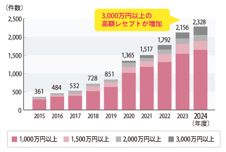 2024年度の医療費のうち、1カ月に1,000万円以上の高額な医療費がかかった件数は2,328件で、過去最多となり、なかでも3,000万円以上の高額レセプトが大きくふえていました。