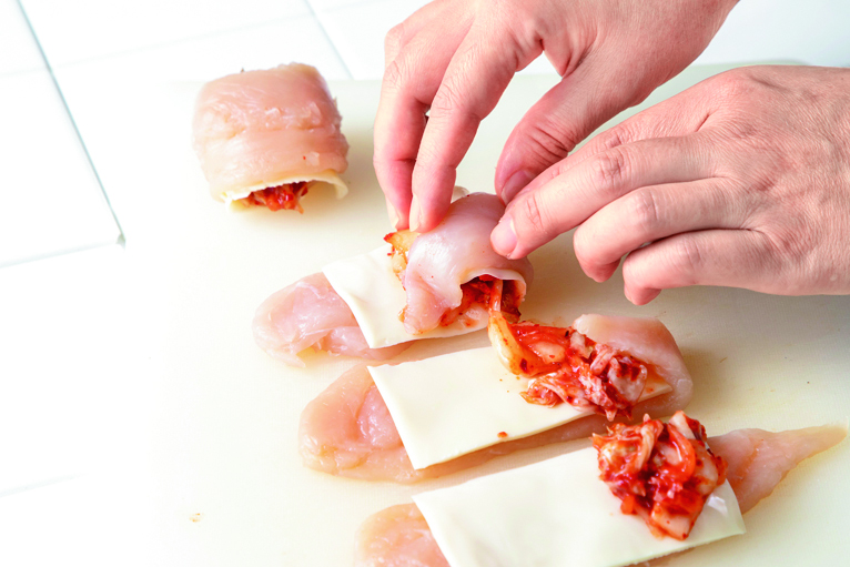 鶏ささみ肉にチーズをのせ、手前にキムチをおいて端から折りたたみます。