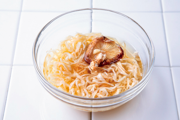 切り干し大根と干ししいたけは水に浸けてレンジで加熱すると、手軽に戻せます。